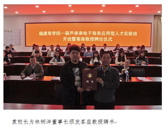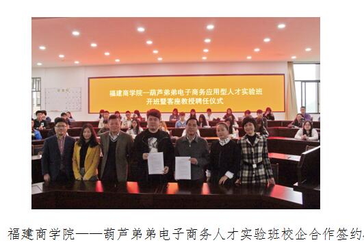 413上午,新葡的京集团8814检测站——葫芦弟弟电子商务应用型人才实验班开班暨客座教授聘任仪式在连江校区举行,新葡的京集团8814检测站筹建工作领导小组副组长、福建商业高等专科学校校长袁新文和福州葫芦弟弟电子商务有限公司董事长林柄洋共同签署校企合作协议,并颁发客座教授聘书。教务处、实训处负责人和经贸系16级本科全体师生参加了仪式。
